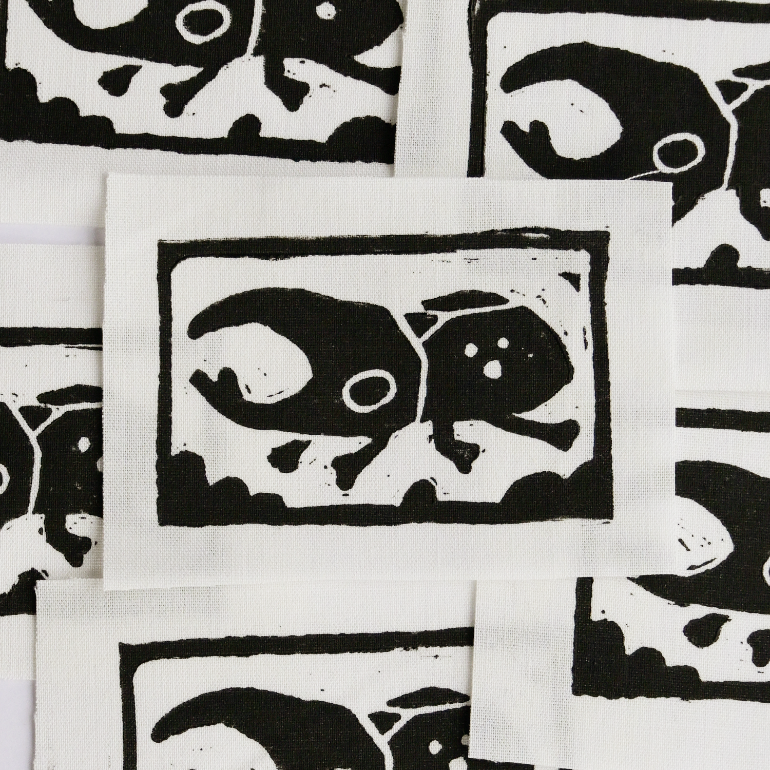A hand-printed 3x1.5" linocut patch featuring a beetle on off-white 100% cotton fabric with washable, permanent black ink.